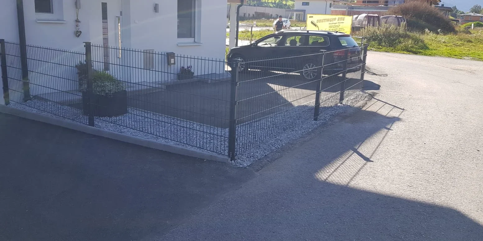 Bei diesem Projekt wurde ein modernes Doppelstabmattenzaunsystem installiert, das sich harmonisch in die Umgebung eines Einfamilienhauses einfügt. Besonders auffällig ist die präzise Ecklösung, die nicht nur funktional, sondern auch optisch ansprechend umgesetzt wurde.