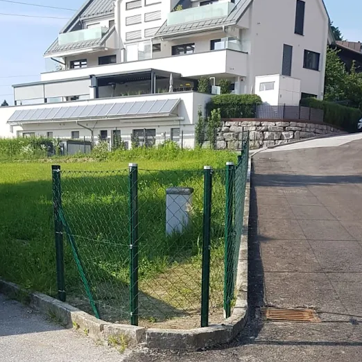 Dank präziser Planung und fachgerechter Montage passt sich der Zaun perfekt dem Gelände an. Die erhöhte Position auf der Mauer sorgt für zusätzlichen Sicht- und Einbruchschutz, ohne die Offenheit der Umgebung zu beeinträchtigen.